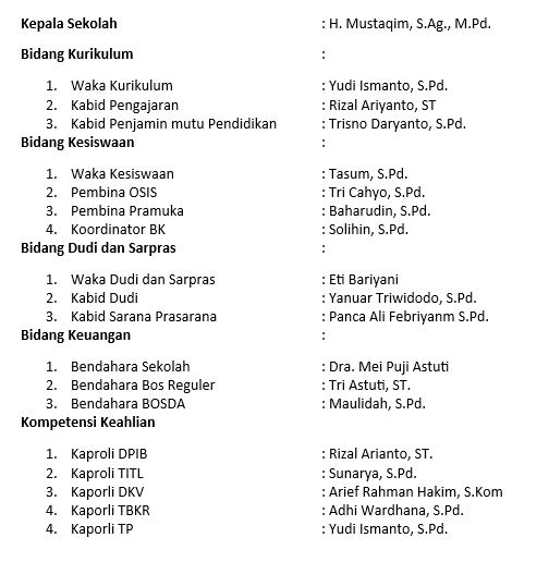 Inilah tim yang berdedikasi di balik kesuksesan SMK Tujuh Lima 1 Purwokerto. Struktur organisasi kami dirancang untuk menciptakan sinergi yang solid antara Kepala Sekolah, Wakil Kepala Sekolah, Guru, Staf TU, dan seluruh komponen sekolah, guna mewujudkan visi dan misi kami.