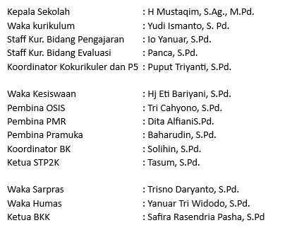 Inilah tim yang berdedikasi di balik kesuksesan SMK Tujuh Lima 1 Purwokerto. Struktur organisasi kami dirancang untuk menciptakan sinergi yang solid antara Kepala Sekolah, Wakil Kepala Sekolah, Guru, Staf TU, dan seluruh komponen sekolah, guna mewujudkan visi dan misi kami.